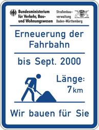 Keywords: Baustelleninformationsschild Bundesautobahn, BASt, November 1998.svg de Baustelleninformationsschild für Bundesautobahnen Entsprechend dem Allgemeinen Rundschreiben Straßenbau Nr 39/1998 vom 12 Oktober 1998 StB 28/38 59 05/36 Va 98 und der Verkündigung im Verkehrsblatt vom 12 November 1998 Diese Verkündigung trat am 12 November 1998 in Kraft Allgemeinen Rundschreiben Straßenbau Nr 39/1998 Verkehrsblatt 23 vom 12 November 1998 Bundesanstalt für Straßenwesen BASt 12 November 1998 + Signs User Mediatus/no-new-version PD-GermanGov Cc-zero Diagrams of construction road signs of Germany Roadworks signs Diagrams of motorway road signs of Germany 1998 set Diagrams of information road signs of Germany |