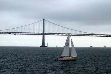 Keywords: bay bridge san francisco oakland bay bridge suspension bridge steel cables sailboat sailing