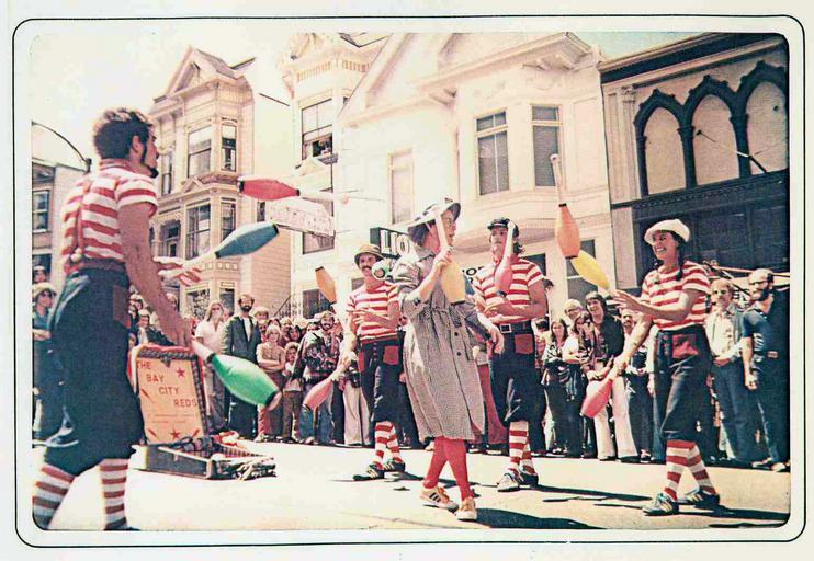 | Keywords: Baycityreds castrostfair 1975.jpg en The Bay City Reds juggling troupe at the Castro Street Fair San Francisco 1975 Performers are from left Dan Mankin Billy Kessler Diana Don Forrest Merle Goldstone On Castro St near 18th St San Francisco CA USA Own BillyKwiki 1975 Own work all rights released 1975 in San Francisco Club juggling Castro Street San Francisco Circus performers 6 prop juggling | ||||