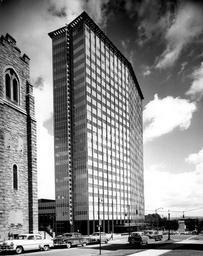 | Keywords: blackandwhite monochrome architecture building outdoor building complex skyline photo border black and white The new B.C. Electric Building on the NE corner of Burrard and Nelson Streets in Vancouver, BC.  Photograph dated October 3, 1957 [Grant-Mann Lithographers, Vancouver].   970 Burrard Street at Nelson Street. Architects: Thompson, Berwick, and Pratt, 1955-57. B.C. Electric Company was taken over by the provincial government in 1961-62 and the building was renamed the B.C. Hydro Building. Prominent local artist B.C. Binning designed the mosaic of blue, green and black tile. In 1995, the building was converted to a condominium complex and renamed and re-addressed as the Electra, 989 Nelson Street. The introduction of this structure in the West End caused the City Planners to rewrite the zoning by-law limiting building height in the district. Subsequently, this allowed a flood of residential tower development which forever changed the face of the neighborhood and, by the 1970s, would cause Vancouver's West End to become the most densely populated area in Canada.  The building at the far left is the First Baptist Church (1911) on the NW corner.  The new B.C. Electric Building on the NE corner of Burrard and Nelson Streets in Vancouver, BC.  Photograph dated October 3, 1957 [Grant-Mann Lithographers, Vancouver].   970 Burrard Street at Nelson Street. Architects: Thompson, Berwick, and Pratt, 1955-57. B.C. Electric Company was taken over by the provincial government in 1961-62 and the building was renamed the B.C. Hydro Building. Prominent local artist B.C. Binning designed the mosaic of blue, green and black tile. In 1995, the building was converted to a condominium complex and renamed and re-addressed as the Electra, 989 Nelson Street. The introduction of this structure in the West End caused the City Planners to rewrite the zoning by-law limiting building height in the district. Subsequently, this allowed a flood of residential tower development which forever changed the face of the neighborhood and, by the 1970s, would cause Vancouver's West End to become the most densely populated area in Canada.  The building at the far left is the First Baptist Church (1911) on the NW corner. |
