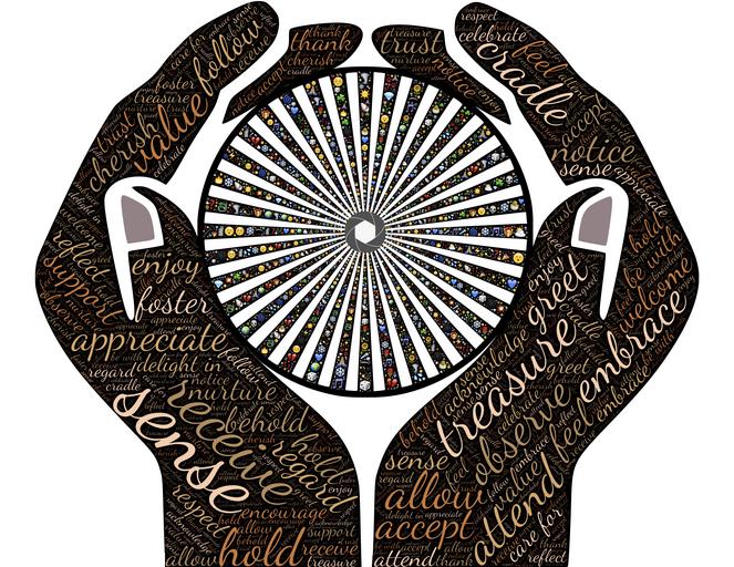 Keywords: be behold emoji symbols alive awake aware being hands holding attention acceptance allowing feel embrace hold touch sense appreciate non-judgment life love affection happiness joy playful delight consciousness awareness wheel