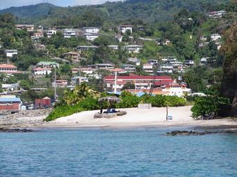 Keywords: beach caribbean tropical coastal seaside ocean community town landscape houses hillside shore coast water hot sunshine