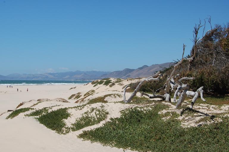 Keywords: beach coast dunes sand blue sky sky driftwood