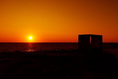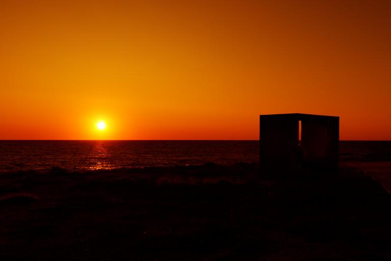Keywords: beach dark dusk evening horizon light nature night ocean orange red bench sea sky stone sun sunset water wave yellow