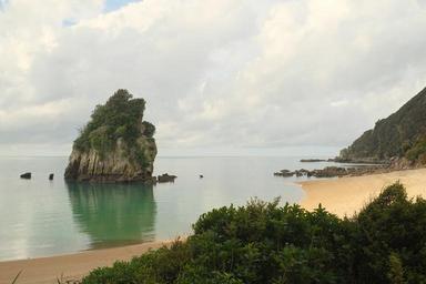 Keywords: Beach east of Taupo Point.jpg Beach east of Taupo Point Own 2015-04-06 Pseudopanax wikipedia en 40 47 21 65 S 172 57 19 45 E Abel Tasman National Park Coasts of New Zealand Stacks of New Zealand