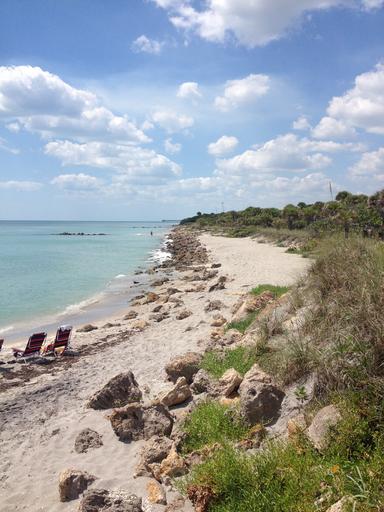 Keywords: beach ocean sand coast travel vacation sunny summer landscape horizon blue sky beach chairs shore florida venice florida