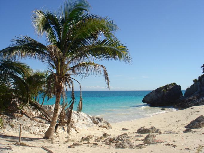 Keywords: beach palm trees sand tropical rocks ocean coast water sea seascape sunny scenic relax vacation landscape