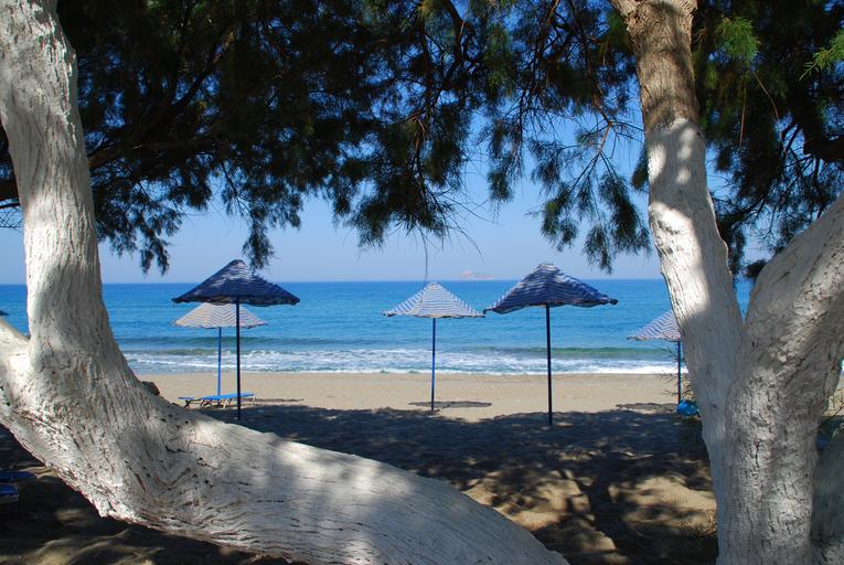 Keywords: beach parasols summer sea holiday mediterranean crete horizon white trees