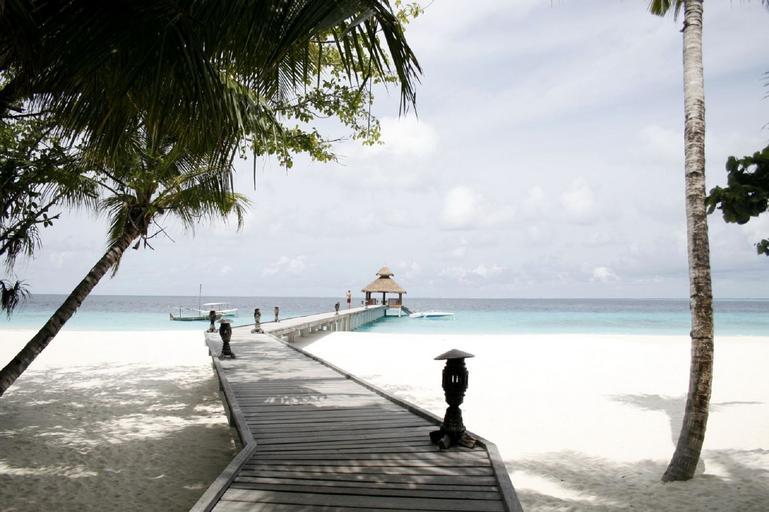 Keywords: beach resort pier ocean beach tropics baa atoll sea seascape shore boat landscape palm trees maldives island clouds vacation travel tourism reethi beach resort