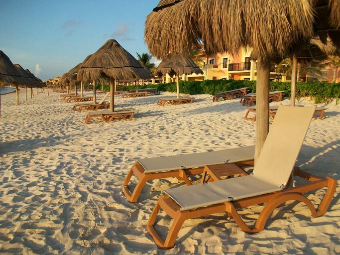 Keywords: beach rest relax sand lounge chair palapas holiday sunset horizon mexico cancun