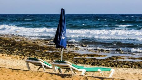 Keywords: beach rocky coast sun bed umbrella tourism vacation sea