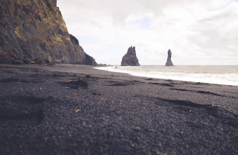 Keywords: beach sand shore coast ocean sea rocks cliffs clouds