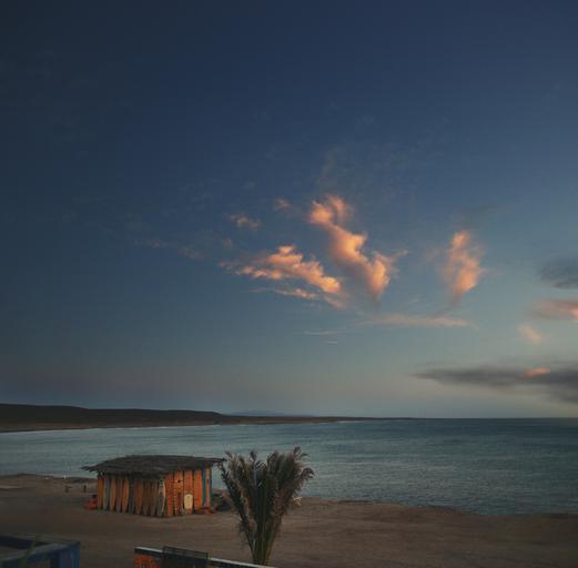 Keywords: beach sand shore ocean sea sunset dusk sky clouds hut trees nature landscape