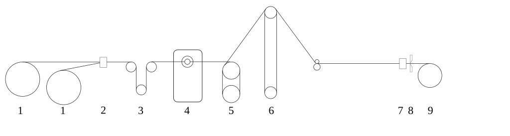 | Keywords: Bead wire line.svg en Bead wire line for making bead wire of tyres<br> 1 - let-off drum 2 - device for producing bead wire tape strand 3 - heater 4 - crosshead extruder 5 - pull-off drum 6 - festoon 7 - paying-on head 8 - cutter die 9 - winding unit hu Huzalkarikagyártó gép<br> 1 leeresztődob 2 pászmásító 3 huzalmelegítő 4 keresztfejes extruder 5 lehúzó 6 kompenzátor 7 léptetőfej 8 vágóbélyeg 9 huzalkarikatekercselő dob own kifo 2011-07-19 Cc-zero Manufacturing processes Tires | ||||