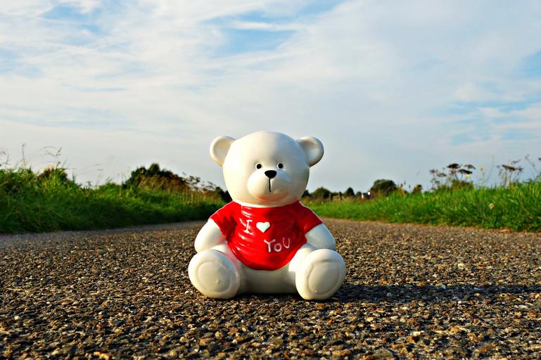 Keywords: bear ceramic bear ceramic figure piggy bank i love you i ♥ you heart symbol love red top sitting road sky roadside