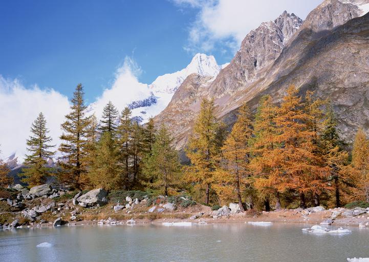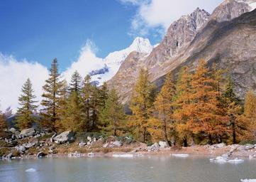 Keywords: utumn engadin schweiz blue meadow larchs trees grass snow mountain coloured alps sunshine bough forest tarn golden sea branch island white valley shadow clouds colors mountain beauty sky snow nature landscape