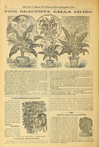 Keywords: Beautify your homes (16162509280).jpg 10 <br> Miss Ella V Baines The Woman Florist Springfield Ohio <br> FIVE BB AXTCM XJI GAJL JL J± X IT/EE i <br> Sew Baby Calla Lily Little Gem ” This Calla only grows <br> about six to eight inches high and is the freest blooming of all <br> the Callas The bloom is pure white The following facts will <br> convince any one of its great superiority over the old sort Of <br> dwarf habit; the same plant will grow and bloom for years <br> without once ceasing and the quantity of bloom which a good <br> plant will produce is astonishing A large plant is hardly ever <br> without one or more flowers All in all it is one of the most de- <br> sirable plants I have ever offered 15 cents each <br> Tlie Black Calla ” Its flowers are enormous fnlly a foot in <br> length Color a clear coal black so intense that it really shows <br> a brilliancy and as may well be imagined it is a flower of most <br> striking oddity and beauty The bulbs are large and should be <br> potted in the Fall and when growth commences set iu a win- <br> dow After blooming the foliage will die down and the bulbs <br> should be kept dry for replanting in the Fall Price of large <br> flowering bulbs 25 cents each <br> Calla Richardia ” Spotted Calla Plant with beautiful <br> spotted leaves It flowers abundantly during the Summer <br> months when planted out in the open border The flowers are <br> shaped like those of a Calla aud are pure while shaded with <br> violet inside Keep dry in Winter and start in the Spring like a <br> Dahlia The plant belongs to the same order as Calla Ethiopi- <br> ca Price blooming bulbs 15 centseach Larger size to pro- <br> duce a dozen blooms 25 cents each <br> Calla Ethiopica ” Egyptian Lily This is the well-known <br> Egyptian Lily or Lily of the Nile with large white flowers <br> broad foliage and it will prosper under very adverse circum- <br> stances If you want large Callas send to me as I am head- <br> quarters for them I have three sizes Price small plants to <br> bloom next Winter 10 cents each; strong blooming bulbs 25 <br> cents each; mammoth bulbs to make ten to twelve blooms 50 <br> cents each <br> Calla Hastata ” This is the yellow Calla It is just like the <br> others only the flower i« a lemon yellow It is very distinct and <br> will enrich any one s collection 20 Cents each <br> SPECIAL OFFER The set of five distinct Callas <br> all blooming bulbs for 60 cents <br> CLERODENDRON BALEOTJRII <br> A plant of great <br> beauty Makes a grand <br> bedding plant where <br> both foliage and bloom <br> are desired The flow- <br> ers which are of a <br> bright scarlet are en- <br> cased by a bag - like <br> calyx of pure white <br> the trusses or panicles <br> of flowers are upwards <br> of six inches in length <br> and when trained upon <br> trellises and hangiug <br> down have a rich and <br> elegant appearance <br> Price 5 centseach <br> CRAPE <br> MYRTLE <br> Handsome shrubs <br> when in bloom The <br> flowers cover the- en- <br> tire plant Hardy in <br> the South We have balfourii <br> three kinds m the fol- <br> lowing colors ” pink crimson and purple 5 cents each <br> CALADITJM ESCULENTUM <br> One of the most beautiful and striking ornamental-fohaged <br> plants in cultivation either for culture in large pots or tubs or <br> for plantingout on the lawn Will grow in any garden soil and <br> is of the easiest culture When of full size it stands about five <br> feet high with immense leaves often measuring four feet in <br> length by two and one-half in breadth Smooth of bright green <br> color beautifully veined and variegated with dark green The <br> roots should be preserved in dry sand m the cellar during Win- <br> ter out of danger from frost Price good bulbs 10 cents each; <br> large bulbs 25 cents each; extra large bulbs 50 cents each <br> FANCY-LEAVED CALADIUMS <br> These plants are especially valuable for <br> decorating conservatories window boxes <br> and as specimen plants They are mag- <br> nificent planted in beds outdoors noth- <br> ing being more showy The brilliant <br> cardinal red cream pink white and <br> various shadesof green that are displayed <br> in the veimngsand blotches of the leaves <br> cannot be obtained in any other class of <br> plants For arranging floral baskets or <br> table decorations they are qu'te as hand- <br> some as any flower We have a fine col- <br> lection of first-class distinct brilliantly- <br> marked varieties t'sually the bulbs of <br> Fancy Caladiums that are sent out are so <br> small as to tail to grow We have been <br> fortunate in securing a stock of extra <br> larce bulbs Try them Price well- <br> dried extra large bulbs our selection of sorts 25 <br> centseach These are the finest bulbs you ever saw <br> of Fancy Caladiums <br> FANCY CALAPIUMS 41878697 131125 64689 Page 10 Text http //www biodiversitylibrary org/page/41878697 1918 10 1080/00222939708680643 Ella V Baines Firm ; Henry G Gilbert Nursery and Seed Trade Catalog Collection NameFound Clerodendron NameConfirmed Clerodendron EOLID 13174936 NameBankID 276907 NameFound Ethiopica NameConfirmed Ethiopica EOLID 66302 NameBankID 4162235 NameFound Richardia NameConfirmed Richardia EOLID 29640 NameBankID 387684 Biodiversity Heritage Library Beautify your homes 1901 Garden Stories Bulbs Plants Catalogs Flowers Plants Ornamental Roses Seed industry and trade Seeds Trade catalogs U S Department of Agriculture National Agricultural Library bhl page 41878697 dc identifier http //biodiversitylibrary org/page/41878697 bhlGardenStories BHLinbloom bulbs plants plants ornamental u s department of agriculture national agricultural library bhlgardenstories bhlinbloom Information field Flickr posted date ISOdate 2015-01-23 Check categories 2015 August 24 CC-BY-2 0 BioDivLibrary https //flickr com/photos/61021753 N02/16162509280 2015-08-24 08 52 45 cc-by-2 0 PD-old-70-1923 Beautify your homes Photos uploaded from Flickr by Fæ using a scr