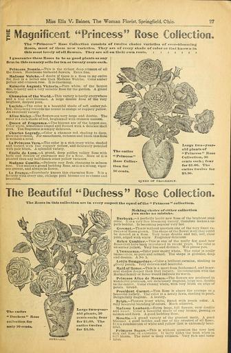 | Keywords: Beautify your homes (16164037997).jpg Miss Ella V Baines The Woman Florist Springfield Ohio <br> 27 <br> 66 <br> 59 <br> The Princess Rose Collection consists of twelve choice varieties of ever-blooming <br> Roses most of them new varieties They are of every shade of color or tint known in <br> this most lovely of all flowers They are all on their own roots i i i t <br> I guarantee these Roses to be as good plants as any <br> firm In this country sells for ten or twenty cents each <br> Princess Botitiie This is the richest deep crimson of all <br> the Roses Handsome buda and flowers Extra fine <br> Madame Welche I doubt if there is a Rose in my entire <br> list that is a better one than Madame Welche Color amber <br> yellow and crimson rose It is charming <br> Kaiseriti Augusta Victoria Pure white of the largest <br> size is hardy and a very suitable Rose for the garden A grand <br> variety <br> Champion of the World This variety is hardy everywhere <br> and a true ever-bloomer A large double Rose of the very <br> brightest deepest pink <br> Luciole The color is a beautiful shade of soft amber yel- <br> low deepening towards the center to orange or coppery yellow <br> An excellent variety <br> Aline Sistey The flowers are very large and double The <br> color is a rich shade of red brightened with crimson maroon <br> Queen of Fragrance The blooms are of the largest size <br> Color white sometimes tinged and flushed with a delicate shell <br> pink The fragrance is simply delicious <br> Charles Legrady Color a chamois red shading to deep <br> glowing crimson For smoothness richness and finish this Rose <br> is without a rival <br> La Princess Vera The color is a rich ivory white shaded <br> and veined with fine coppery yellow and delicately penciled <br> with pule blush A splendid variety <br> Etoile de Lyon A grand deep golden yellow Rose with <br> buds and flowers of enormous size for a Rose More of it is <br> planted than any half dozen other yellow varieties <br> Madame Camille Delicate rosy flesh changing to salmon <br> rose This makes a grand bedding Rose as it is a strong vigor- <br> ous grower and always in flower <br> La France Everybody knows this charming Rose It is a <br> favorite with every one its large pink blooms are so chaste and <br> beautiful <br> QiJEEN OF FBAGRANCE <br> The entire <br> Princess <br> Rose Collec <br> tlon for <br> 50 cents <br> Large two- year- <br> old plants of <br> Princess Rose <br> Collection 30 <br> cents each ; four <br> for ยง1 00 The <br> entire twelve foi <br> 50 <br> 6ยฃ <br> 5 <br> The entire <br> Duchess Rose <br> collection for <br> only 50 cents <br> The Roses In this collection are in every respect the equal of the Princess collection <br> Making choice of either collection <br> you make no mistake <br> Burbank A perfectlv hardv new Rose of the brightest pink <br> color It is a very free blooming variety therefore makes a su- <br> perb bedder Is becoming popular very fast <br> Coronet This is without question one of the very finest va- <br> rieties of Roses grown The shape of the flower is all that could <br> be desired in a Rose Very large double and full soft clear <br> pink edged with white Fragrance delicious <br> Helen Cambier This is one of the really few good new- <br> Roses that have been introduced in recent years The color is <br> an amber yellow Very fine and distinct Will please you <br> L'lunocence Color pure snowy white The color is really <br> immaculate so pure and refined The shape is globular deep <br> and double A No 1 <br> Lottie Biitttgardner Color a brilliant carmine shading to <br> silvery peach Very delicate and beautiful <br> Maid of Honor This is a sport from Bridesmaid and is sev- <br> eral shades deeper than that variety Its connection with the <br> Mermet family of Roses would indicate its worth <br> Princess Alice de Monaco The flowers are produced in <br> wonderful profusion are deliriously fragrant large size double <br> to the center Color creamy white with rosy blush on edge of <br> petals Grand <br> President Carnot This Rose is above the average as a <br> beautiful variety The color is a lovely fawn shading to pearl <br> Delightfully fragrant A beauty <br> Sylph Flowers ivory white tinted with peach color A <br> very beautiful blending of colors Much admired <br> Madame Lambard Extra large full flowers very double <br> and sweet Color a beautiful shade of rosy bronze passing u <br> salmon and fawn A good bedding Rose <br> Mosella A grand variety of the greatest merit A good <br> bloomer a good bedder aud one of the sweetest of all Roses <br> It is a combination of white and yellow that is extremely beau- <br> tiful <br> Princess Sa -an This is without question the very best <br> rich red Rose in existence It fairly hides the bush when in <br> full bloom The color is deep crimson Very rich and beau- <br> burbank 1 tilul 41878680 131125 64689 Page 27 Text http //www biodiversitylibrary org/page/41878680 1918 10 1080/00222939708680643 Ella V Baines Firm ; Henry G Gilbert Nursery and Seed Trade Catalog Collection Biodiversity Heritage Library Beautify your homes 1901 Garden Stories Bulbs Plants Catalogs Flowers Plants Ornamental Roses Seed industry and trade Seeds Trade catalogs U S Department of Agriculture National Agricultural Library bhl page 41878680 dc identifier http //biodiversitylibrary org/page/41878680 bhlGardenStories BHLinbloom bulbs plants plants ornamental u s department of agriculture national agricultural library bhlgardenstories bhlinbloom Information field Flickr posted date ISOdate 2015-01-23 Check categories 2015 August 24 CC-BY-2 0 BioDivLibrary https //flickr com/photos/61021753 N02/16164037997 2015-08-24 08 50 23 cc-by-2 0 PD-old-70-1923 Beautify your homes Photos uploaded from Flickr by Fรฆ using a script |