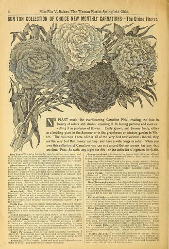 | Keywords: Beautify your homes (16348111401).jpg and free advertising by the new- <br> papers of the whole country as this sensational Carnation It <br> was sold forS30 000 The size is enormous of a true pink color <br> Altogether atwentieth century Carnation Everylhinghnsbecn <br> claimed for it and my own opinion is that it will justify the <br> claim <br> Painted Lady Another grand Carnation with enormous <br> sized flowers often measuring three and a half inches in diame- <br> ter at the same time being one of the freest blooming Carna- <br> tions we have ever seen Ground color of flower the purest <br> white very handsomely penciled with richest crimson <br> Rose Otieen One of the most fragrant Carnations we have <br> seen Color a pure soft ro e a most continuous bloomer and <br> distinct in color from any other sort offered Greatly admued <br> by all who have seen it growing here <br> Triumph This variety has been greatly admired for its de- <br> sirable color wherever it has beeuseen being a beautiful pure <br> rich pink flowers large size and very freely produced ' Plant <br> of grand habit and vigorous growth It is a superb variety <br> Whitcomb Riley The ground color is the faintest blush <br> ligblly penciled in soft pink The bloom is fluffy in appearance <br> exquisitely beautiful in form One of the grandest of all Carna- <br> tions <br> Yellow Jacket The color of the flower is orange flaked <br> and is broadly striped with delicate carmine Very fragrant It <br> lias proved one of the free-t bloomers within my knowledge <br> single plants often carrying forty lo sixty buds anil blossoms at <br> one lime One of the Very best varieties 41878701 131125 64689 Page 6 Text http //www biodiversitylibrary org/page/41878701 1918 10 1080/00222939708680643 Ella V Baines Firm ; Henry G Gilbert Nursery and Seed Trade Catalog Collection NameFound Carna NameConfirmed Carna EOLID 8886074 NameBankID 2992271 Biodiversity Heritage Library Beautify your homes 1901 Garden Stories Bulbs Plants Catalogs Flowers Plants Ornamental Roses Seed industry and trade Seeds Trade catalogs U S Department of Agriculture National Agricultural Library bhl page 41878701 dc identifier http //biodiversitylibrary org/page/41878701 bhlGardenStories BHLinbloom bulbs plants plants ornamental u s department of agriculture national agricultural library bhlgardenstories bhlinbloom Information field Flickr posted date ISOdate 2015-01-23 Check categories 2015 August 24 CC-BY-2 0 BioDivLibrary https //flickr com/photos/61021753 N02/16348111401 2015-08-24 08 51 12 cc-by-2 0 PD-old-70-1923 Beautify your homes Photos uploaded from Flickr by FĂŚ using a script |