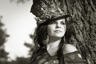 Keywords: beauty woman flowered hat cap cosmetics luck feeling hair hair styling black hair brunette shoulders bare eye shadow fantasy portrait face beautiful girl joy of life young healthy smile happy joy all wellness