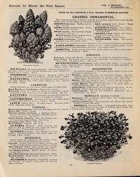 | Keywords: Beckert's garden field and flower seeds (Page 36) (16561289725).jpg  Annuals for Bloom the First Season <br> WM C BECKERT <br> ALLEGHENY PA <br> PRICE OF ALL PACKETS 5 CTS UNLESS OTHERWISE QUOTED <br> GRASSES ORNAMENTAL <br> Beds composed entirely of Grasses with the tall varieties planted in the center and the <br> shorter ones used for edging are especially beautiful <br> Feathery and ele- <br> Pretty <br> ACROSTIS nebulosa <br> gant; 1 feet <br> AVENA sterilis Animated Oats <br> drooping heads; i feet <br> BRIZA maxima The large form of Quak- <br> ing Grass; VA feet <br> Minima gracilis Small Quaking Grass; <br> 1 foot ; elegant for bouquets <br> BROMUS brizaeformis Useful in many <br> decorative ways when dried ; 2 feet <br> Mignonette Machet <br> ICE PLANT Mesembryanthemum <br> and stems covered with a shining granular coat; plant trailing <br> baskets vases borders Mixed <br> IPOMOPSIS Standing Cypress Handsome plants with <br> long spikes of red or bright scarlet flowers and fine foliage Mixed <br> KAUXJFUSSIA Compact free-blooming from 6 inches to 1 <br> foot high Flowers blue violet white crimson or rose ; graceful <br> and pretty Mixed <br> LARKSPUR <br> Rocket Larkspurs are very showy; flower-spikes of bright colors <br> Dwarf Double and Tall Double Mixed colors of each <br> Branching Bears long spikes of flowers on long stems blooms <br> continuously until cut down by frost; fine for cutting Pkt 10c <br> LAVATERA Free-blooming plant growing about 2 feet tall <br> and producing its sho\ y red flowers all through the summer <br> LEPTOSIPHON Beautiful in flower and foliage giving <br> fine effects when grown in masses ; 6 inches Mixed <br> LINTIM Scarlet Flax Of great beauty Blossoms bright <br> scarlet stems and foliage fine <br> LOBELIA <br> Erinus speciosa superba Dark blue with large white eye; trailing <br> Erin us alba White; trailing <br> Speciosa superba compacta A charming variety; <br> flowers rich deep blue strikingly relieved by a con- <br> spicuous white eye Pkt 10 cts <br> Crystal Palace compacta Dark blue flowers ; fine <br> for edging and carpet bedding Pkt 10 cts <br> Compacta alba White ¢ Pkt 10 cts <br> Prima Donna Crimson Pkt 10 cts <br> LVNARIA Honesty Hardy biennial and <br> must be sown in autumn or early spring for flowers <br> the first year Flowers white and double <br> LUPINUS Sun-dial Very effective in mixed <br> borders The seed should be sown where plants are <br> to stand; 2 feet Mixed <br> MARIGOLD <br> Showy plants for midsummer and autumn bloom <br> 1 to 2 feet tall free-flowering and easy to grow <br> Eldorado Flowers from 10 to 14 inches around very <br> double of bright golden orange and primrose shades <br> Dwarf African Dwarf dense growth and immense <br> double flowers of a peculiar shade of golden yellow <br> Tall Double French Mixed; flowers of various <br> bright colors <br> Dwarf Double French Plants low and compact Mixed <br> Signata pumila Dwarf plants; forms a true gilt <br> edge for beds <br> MATHIOLA bicornis Delightfully fragrant <br> lilac flowers A capital edging plant for dry and <br> sunny exposures <br> COIX lachryma Job's Tears Broad <br> blades and drooping seeds <br> ERACROSTIS elegans Love Grass <br> CYNERIUM argenteum Pampas Grass <br> See Perennials <br> LACURUS ovatus Hare's Tail Grass <br> Small white spikes; 2 feet <br> STIPA pennata Feather Grass <br> TRICHOL/EANA rosea Rose-tinted; <br> 2 feet <br> « ° The Grasses are enjoying a revival of popularity in bothLandscape Gardening and small grounds <br> GAIULAR DIA Lorenziana Blanket Flower Showy bedding plants covered <br> with double flowers from midsummer until frost; many bright colors <br> GODETIA Bright and attractive little plants always gay with a crop of pretty <br> white rose or crimson flowers Mixed <br> HIBISCUS <br> Africanus Showy and effective Large cream-colored flowers with brown center <br> Giant Yellow The flowers attain a great size measuring 7 to 8 inches in diameter; <br> canary-yellow with garnet throat Pkt 10 cts <br> HUNNEMANNIA fumariaefolia Giant Yellow Tulip Poppy A very showy <br> plant Large buttercup-yellow poppy-like flowers produced in great abundance all <br> summer; 2 feet Pkt 10 cts <br> listening waxen leaves MIGNONETTE <br> The matchless perfume of this modest flower renders it one of the <br> most popular annuals grown <br> Defiance Spikes very large and deliciously fragrant The indi- <br> vidual flowers are of immense size forming a graceful as well as a <br> compact spike; fine for cutting; keeps a long time Pkt 10 cts <br> Machet The best variety for pots ; is dwarf and free-blooming ; <br> flower-spikes bright reddish maroon; very sweet Pkt 10 cts <br> Golden Machet Differs from the type in its heavy spikes of <br> golden yellow blossoms Pkt 10 cts <br> Colden Queen Plants dwarf; flowers bright golden yellow Oz 20c <br> Victoria Flowers dark red and very fragrant Pkt 10 cts <br> Large-flowering The old and well-known Mignonette still as <br> sweet as any Oz 15 cts <br> MIMULUS MONKEY FLOWER <br> Moschatus The well-known Musk Plant with strongly-scented <br> yellow flowers Pkt 10 cts <br> Tigrinus grandiflorus Large-flowering new tigered and spotted <br> varieties in many rich colors <br> NIGELEA Love-in-a-Mist A delicately pretty plant; light <br> blue or white flowers set in a mist of feathery green foliage and <br> bearing curious seed-pods Mixed <br> Lobelia Compacta 43294142 138660 69754 Page 36 Text http //www biodiversitylibrary org/page/43294142 1901 10 5962/bhl title 69754 Henry G Gilbert Nursery and Seed Trade Catalog Collection ; Wm C Beckert Firm NameFound Africanus NameFound Bromus NameConfirmed Bromus EOLID 108079 NameBankID 2660780 NameFound Coix NameConfirmed Coix EOLID 108123 NameBankID 2661572 NameFound Compacta alba NameFound Erinus speciosa superba NameFound Godetia NameConfirmed Godetia EOLID 5466836 NameBankID 3471363 NameFound Hibiscus NameConfirmed Hibiscus L EOLID 60741 NameFound Hunnema