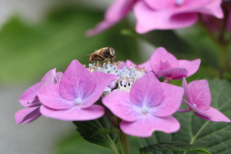 Keywords: bee hydrangea blossom bloom plate hydrangea summer plant nature purple pink