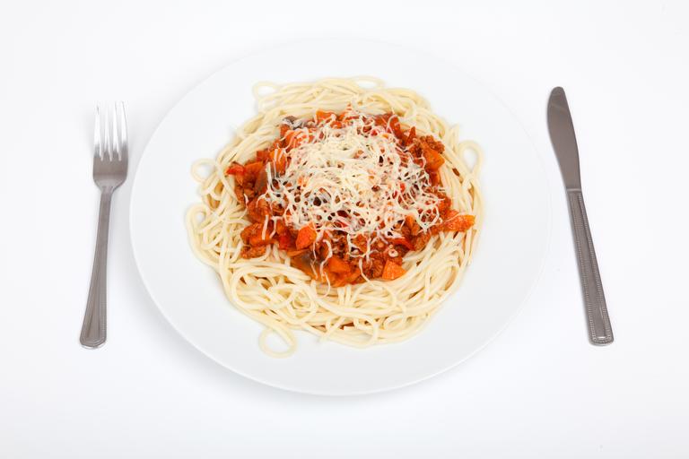 Keywords: beef cheese cuisine delicious dinner food fresh isolated italian meal meat pasta plate portion sauce spaghetti tasty tomato white