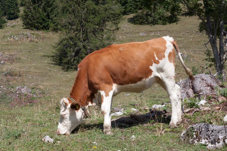 Keywords: beef jungrind calf alm bell meadow graze nature agriculture livestock pasture cattle cow animal ruminant alpine herbivores summer highlands upper bavaria mammal rock rocks forest
