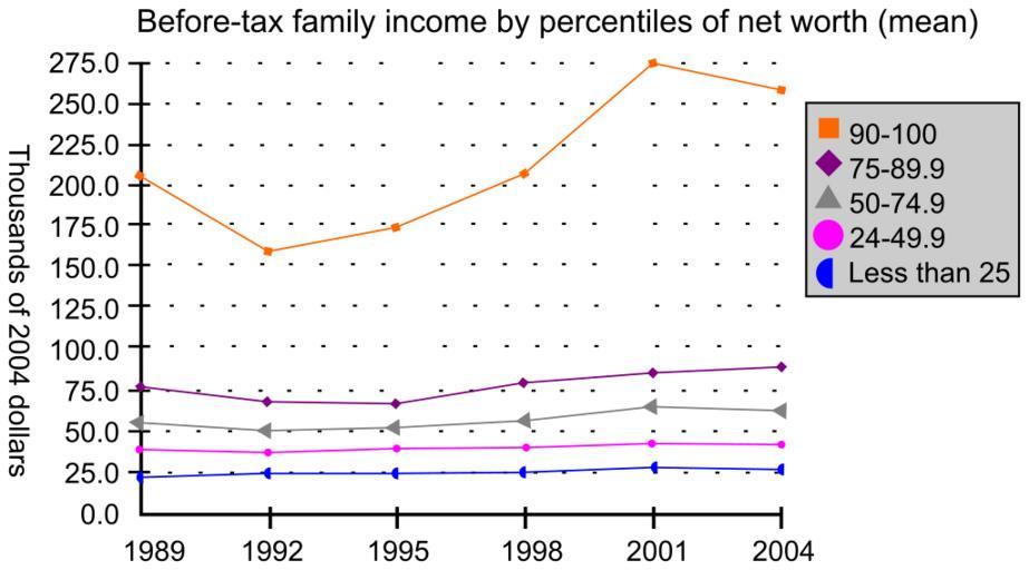 | Keywords: BeforetaxfamilyincomemeanUS1989-2004.svg en Mean before-tax family income by percentiles of net worth in the USA from 1989-2004 In other words this is US income distribution from 1989-2004 Created with OpenOffice Calc Data obtained from https //www federalreserve gov/pubs/oss/oss2/2004/Chartbook xls This chart is a retraced SVG copy of the original file File BeforetaxfamilyincomemeanUS1989-2004 gif by en User Analoguni The original was released into public domain by the author; this SVG copy is also released into the public domain 2012-01-29 own traced original by en User Analoguni Premeditated Chaos File BeforetaxfamilyincomemeanUS1989-2004 gif cc-zero Check categories 2012 January 30 en wikipedia Household_income_in_the_United_States 2 Uploaded with UploadWizard Income distribution in the United States |