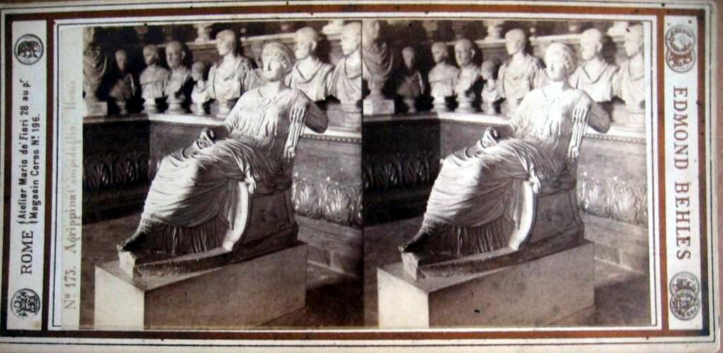 | Keywords: Behles, Edmond (1841-1924) - n. 175 - Agrippina - Campidoglio, Roma.jpg Edmond Behles 1841-1924 - Agrippina rectius Sant'Elena - Campidoglio Roma Stereofotografia Numero di catalogo 175 Edmond Behles 1841-1924 - Agrippina rectius Helena of Constantinople Capitoline museums Rome Stereo card Catalogue 175 own scan < 1924 Edmond Behles 1841-1924 PD-old Historical images of Rome by Edmond Behles 175 Stereo cards of Rome Musei capitolini Seated statue of Helena of Constantinople Rome 1900s | ||||
