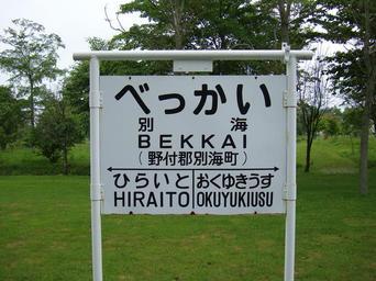 | Keywords: Bekkai station01.JPG Bekkai Station Running in board on Bekkai railway Memorial park Disused train stations on Shibetsu Line 別海駅 駅名標 別海町鉄道記念公 2009-07-18 Own <font color 000 >221 20</font> <font color 000 >talk</font> Stations of Shibetsu Line Betsukai Hokkaido Train station signs of Japanese National Railways Files by User 221 20/Sony DSC-W300 |