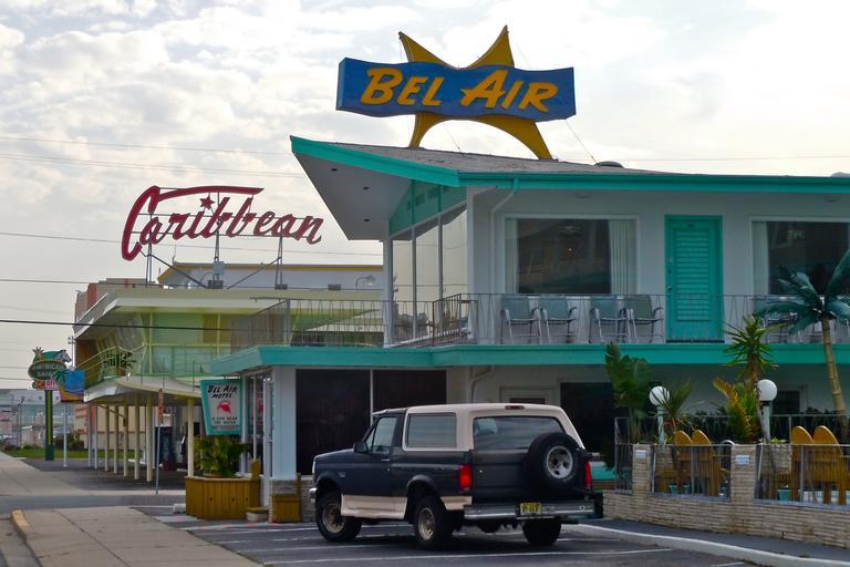 Keywords: Bel Air DooWop WCNJ.jpg en Bel Air and Caribbean Motel signs in Wildwood Crest New Jersey The Caribbean Motel on NRHP since August 24 2005 At 5600 Ocean Ave in Wildwood Crest south of Wildwood New Jersey in Cape May County Built 1958 in a distinctive modern Las Vegas Jetsons style aka Googie style or locally Doo-Wop Photographer facing south 2011-04-23 own Smallbones cc-zero Uploaded with UploadWizard Caribbean Motel Googie architecture |