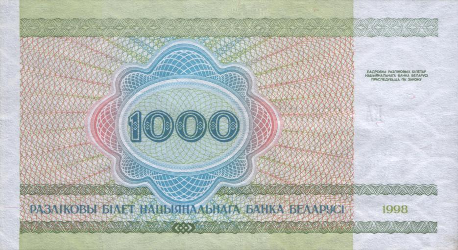 | Keywords: Belarus-1998-Bill-1000-Reverse.jpg be 100 000 ублёў 1000 roubles of Belarus 1998 es 100 000 rublos 1000 ублей Бело уссии 1998 own scan 1998 National Bank of Republic of Belarus ациональный банк Республики Бела усь ацыянальны Банк Рэспублiкi Бела усь PD-BY-exempt banknotes Banknotes of Belarus 1994-1999 Banknotes with a face value of 1000 1998 banknotes |