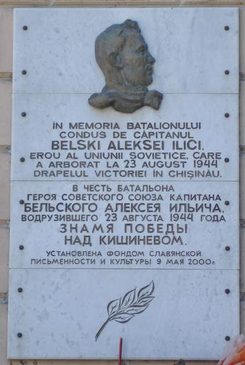 Keywords: Beltskii memorial.jpg емо иальная доска в честь батальона ге оя Советского Союза капитана Бельского Алексея Ильича вод узившего 23 августа 1944 года знамя Победя над Кишинёвом Own 2006 User Zserghei FoP-Moldova Centru Monuments and memorials in Chișinău Multilingual plaques in Moldova Plaques in Chișinău