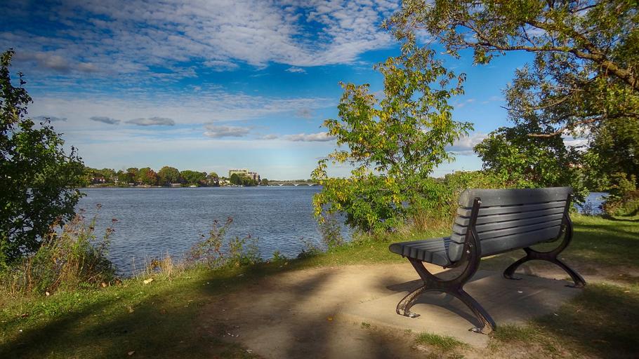 Keywords: bench riverside park grass fall