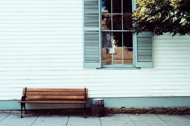 Keywords: bench seat house front sitting relax window facade settee empty wooden shutters wood siding sidewalk