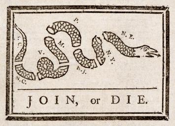 | Keywords: Benjamin Franklin - Join or Die.jpg This w political cartoon attributed to Benjamin Franklin originally appeared during the French and Indian War but was recycled to encourage the Middle and New England Colonies American colonies to join the Albany Plan for Union From The Pennsylvania gazette 9 May 1754 Abbreviations used South Carolina South Carolina North Carolina North Carolina Virginia Virginia Maryland Maryland Pennsylvania Pennsylvania New Jersey New Jersey New York New York and New England New England This is a somewhat odd division New England was four colonies and Delaware and Georgia are missing Ce dessin de presse attribué à Benjamin Franklin fut d'abord publié pendant la guerre franco-indienne au cours de la w guerre de Sept Ans fr puis réutilisé pour inciter les colonies américaines à s'unir contre la couronne britannique Dieser politische Cartoon Benjamin Franklin zugeschrieben erschien während des Franzosen- und Indianerkrieges wurde aber wieder verwendet um die amerikanischen Kolonien aufzurufen sich gegen die britische Herrschaft zusammen zu schließen cph 3g05315 1754-05-09 Creator Benjamin Franklin File Benjamin Franklin - Join or Die original png - Original LoC scan PNG File Benjamin Franklin - Join or Die original jpg - Original LoC scan JPG File Benjamin Franklin - Join or Die png - Restoration PNG File Benjamin Franklin - Join or Die jpg - Restoration JPG Levels adjusted against the colour cubes provided slight sharpening stains on paper removed though inkblobs and such likely to be from the original printing were left in assessments 1 Join or Die 1 PD-old-100 Benjamin Franklin's Join or Die 12 12 15 June 2010 UTC Benjamin Franklin - Join or Die jpg French and Indian War American Revolution Designs by Benjamin Franklin Snakes in art Animals facing right in art 1754 cartoons |