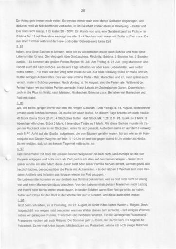 | Keywords: Bennewitz Fortsetzung der Chronik zusammengefasst 0019.jpg Bennewitz - Chronik einer Kürschnerfamilie Abschrift der Seite siehe unten Dieser Teil ist überschrieben mit <br/>Fortsetzung der Chronik der Familie Bennewitz in Wurzen Hier in diesem Kasten muß sich die alte Chronik der Familie Bennewitz befinden welche in der Zeit von 1692 bis 1835/39 geschrieben worden ist und Auskunft über die Familie während dieser Zeit gibt Um die Chronik der Familie Bennewitz deren alte Aufzeichnungen vom Jahre 1692 bis 1835/39 sich in dem Buche befinden welches sich in dem vorhergehenden Kasten befindet fortführen zu können ließ ich dieses Buch anfertigen weil das alte Buch keine alten Blätter mehr hatte <br/> Wurzen im August 1909 Ernst Oskar Bennewitz Neun Generationen Kürschnermeister Bennewitz in Wurzen seit 1652 bis zur Flucht 1952 immer an gleicher Stelle Albert-Kuntz-Straße 1 Ecke Schuhgasse Anschließend in Frankfurt/Main Die zehnte Generation Otto Bennewitz jetzt 2010 in Garmisch-Partenkirchen das Haus ist wieder in Familienbesitz Nachfolgend die nochmalige mit einem Texterkennungsprogramm gelesene unkorrigierte Abschrift der abgebildeten Seite Blatt 20 der Abschrift Der Krieg geht immer noch weiter Es werden immer noch eine Menge Soldaten eingezogen und dadurch weil wir Militäreffecten verkaufen ist im Geschäft immer etwas in Bewegung - Butter und Eier sind recht knapp 1 Ei kostet 20 - 30 Pf Ein Kunde von uns eine Gutsbesitzersfrau Fichtner in Schöna Nr 17 bei Mokrehna versorgt uns aller 3 - 4 Wochen noch etwas mit Butter u Eier u s w Da nun aber Fichtner während der Heu- und später Getreideernte keine Zeit S 95 haben uns diese Sachen zu bringen gehe ich zu wiederholten malen nach Schöna und hole diese Lebensmittel für uns Der Weg geht über Großzschepa Röcknitz Schöna 3 Stunden hin 3 Stunden zurück - Es kommen die großen Ferien Beginn 15 Juli Am Freitag d 21 Juli ging Mariechen und Rudolf auch mit nach Schöna An diesem Tage erhielten wir aber keine Lebensmittel weil selbst nichts hatten - Für Rudi war der Weg doch etwas zu viel Auf dem Rückweg wurde er müde und ich mußte selbigen Achselreiten Das war eine schöne Partie - Wir Mariechen und ich sind später auch versch male in Schöna gewesen Nach Montag d 14 August sind die Ferien alle Während der Ferien haben wir nur kleine Partien gemacht Nach Leipzig im Zoologischen Garten Dornreichenbach in die Pilze im Wald nach Meissen Nimbschen Grimme u s w Bei allen war Mariechen und Rudi mit dabei S 96 Wir die Eltern gingen immer nur eins mit wegen Geschäft - Am Freitag d 18 August sollte wieder jemand nach Schöna kommen Da mußte ich allein laufen An diesem Tage brachte ich nach Hauße 48 Stück Eier a Stück 25 Pf 4 Stückchen Butter daß Stück Mk 1 28 2'/2 Pf Quark zu 1 Mark 3 lebendige Hähnchen Stück 3 Mark 1 lebendige Taube zu 1 Mark Alle diese Sachen musste ich tragen im Rucksack oder in ein Säckchen jedes für sich gesackt Außerdem hatte ich auf dem Heimweg noch 5 Pf Äpfel auf der Straße aufgelesen die von Bäumen gefallen waren Ich sah wie so ein Handelsjude aus Diesen Weg trat ich früh 1 4 10 Uhr an und war gegen abend 6 Uhr wieder zu Hauße Da wir wußten daß ich an diesem Tage viel mitbrachte so S 97 kam Großmutter mit Rudi mit unseren kleinen Wagen mir bis halb nach Großzschepa an die vier Pappeln entgegen und holte mich ab Dort packte ich alles auf den kleinen Wagen - Wenn Rudi später einmal als alter Mann diese Zeilen ließt oder seiner Familie hiervon erzählt werden gewiß alle herzlich lachen besonders über die Partie mit Achselreiten - In den letzten 3 Wochen sind viele Soldaten Artillerie und Infantrie aus Wurzen wieder ins Feld gezogen - Die Lebensmittel konnten wir nur deshalb aus Schöna bekommen weil es dort noch nicht so streng war und keine Marken dort dazu brauchten Von den Lebensmitteln bekam Mariechen nach Leipzig und Hanni nach Berlin immer etwas davon In beiden Städten waren Eier fast gar nicht zu haben Butter auf Karten für den Kopf in der Woche fast nur 50 Gramm und diese auch nicht immer S 98 Jetzt beim schreiben es ist Dienstag der 22 August ist recht trübes kaltes Wetter u Regen Strohhutgeschäft war wegen nicht besonders warmen Wetter dieses Jahr schlecht - Seit einigen Wochen haben wir gefangene Russen Franzosen und Serben in Wurzen Für die Gefangenen Russen und Franzosen machen wir auch Mützen Der Sommer geht zu Ende der Herbst kam Es beginnt die Pelzarbeit Da wir viel Arbeit haben Militärmützen und Pelzarbeit nehme ich noch einige Mädchen seealso category Furriers Bennewitz in Wurzen Germany Weitere Bilder und Familien- und Firmenchronik Furrier family Bennewitz in Wurzen Germany since 1652 Own Begonnen 1909 Bennew <span class signature-talk >talk</span> 15 04 7 June 2010 UTC Fortsetzung der Chronik der Familie Bennewitz in Wurzen |