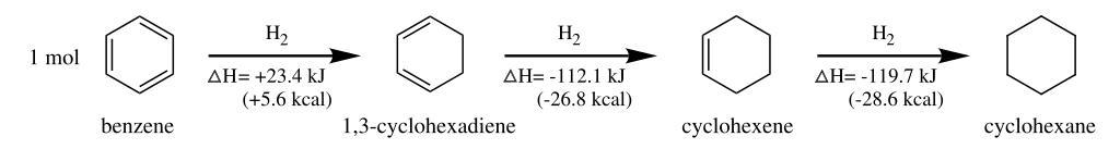 | Keywords: Benzene hydrogenation.svg en Hydrogenation of benzene <br /> The values used here are from the article of Wiberg Nakaji Morgan; J Am Chem Soc 1993 115 9 pp 3527 “3532 http //pubs acs org/doi/abs/10 1021/ja00062a017; DOI 10 1021/ja00062a017 own Wickey-nl 2010-05-20 Reactions of benzene Hydrogenation reactions |