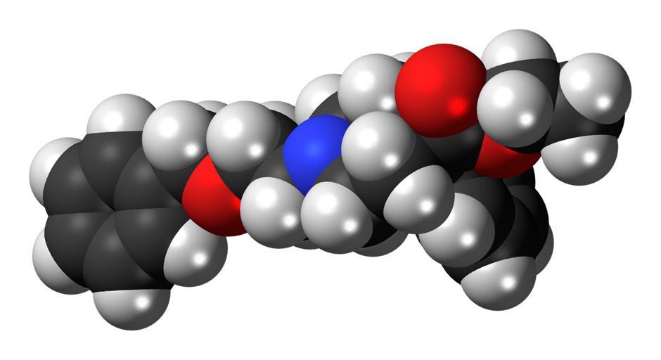 Keywords: Benzethidine 3D spacefill.png Space-filling model of the benzethidine molecule a synthetic opioid Color code 505050 Carbon C black<br> F0F0F0 Hydrogen H white<br> F51E1E Oxygen O red<br> 3C50FA Nitrogen N blue<br> 2011-07-30 own DS Visualizer Jynto talk Ball-and-stick version cc-zero Images by Jynto Space-filling models Carboxylate esters Ethers Opioids Piperidines |