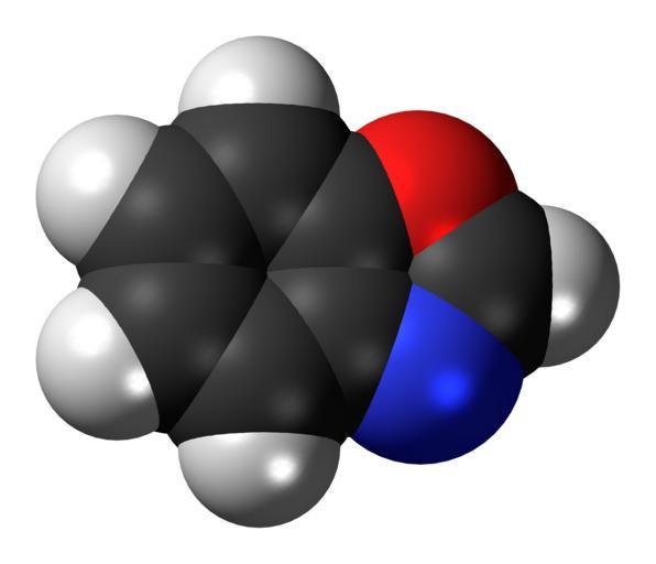 Keywords: Benzoxazole 3D spacefill inverted.png Space-filling model of the benzoxazole molecule a nitrogen-oxygen heterocycle and a simple aromatic ring Colour code 505050 Carbon C black<br> F0F0F0 Hydrogen H white<br> F51E1E Oxygen O red<br> 3C50FA Nitrogen N blue<br> 2011-08-30 own DS Visualizer Jynto talk Ball-and-stick version cc-zero Benzoxazole Images by Jynto Space-filling models |