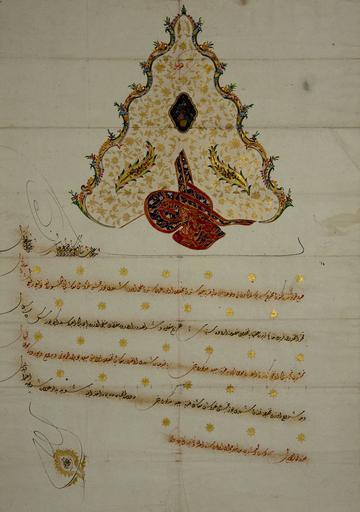 | Keywords: Berat of Ottoman Empire.jpg  en Official document with Sultan's Tughra for awards in Ottoman Empire tr Osmanlı İmparatorluğunda ödül ile birbirlikte verilen padişah'ın tuğrasının olduğu resmî berat between 1823 1861 Institution Topkapi Palace Museum Abdulmecid I PD-Ottoman PD-US Uploaded with UploadWizard Ottoman Turkish manuscripts Order of the Medjidie |