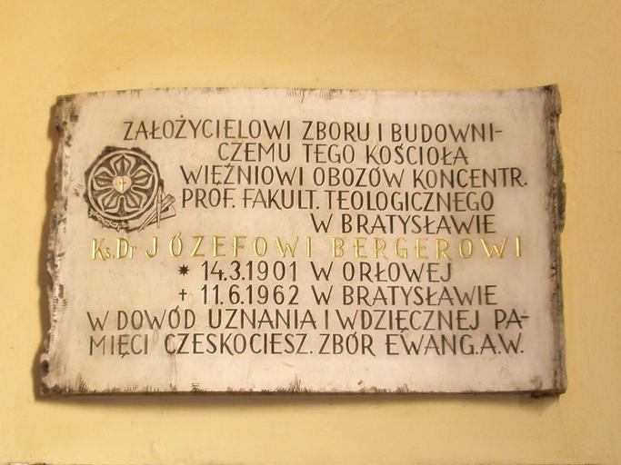 Keywords: Berger plaque.JPG en Plaque commemorating superintendent Józef Berger in Lutheran Church in Český Těšín Na nivách pl Tablica upamiętniająca superintendenta Józefa Bergera w kościele ewangelickim Na Niwach w Czeskim Cieszynie cs Pamětní deska připomínající superintendenta Józefa Bergera v evangelickém kostele v Českém Těšíně Na nivách own own photo Qasinka 08/11/2008 Plaques in Český Těšín Polish inscriptions in the Czech Republic Lutheranism Superintendents ecclesiastical Berger |