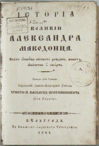 | Keywords: Berkovitsa-IVHM-Istoria-Velikii-Aleksandra-Makedontsa.jpg Исто ия на Великий Александ а акедонца от Х исто Василев П отопопович отпечатана в Белг ад п ез 1844 година съх анявана в къщата-музей Иван Вазов в Бе ковица Бълга ия History of the Great Alexander of Macedonia by Hristo Vasilev Protopopovich published in Belgrad 1844 kept in the house-museum of Ivan Vazov in Berkovitsa Bulgaria Self-taken photo of a material in the public domain due to its age Photo 13 July 2008 Cover 1844 year Vassia Atanassova - Spiritia PD-old House-museum Ivan Vazov Berkovitsa Literature of Bulgaria 1844 books Alexander the Great |