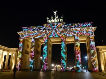 Keywords: berlin facade tungsten building modern big city capital festival of light evening night darkness lighting goal brandenburg gate quadriga landmark places of interest tourist attraction