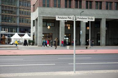 Keywords: berlin historic street names signpost potsdamer platz potsdamer strasse road pedestrians buildings germany city centre