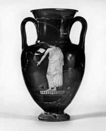 Keywords: Berlin Painter - Doubleen with a Discobolos - Walters 4857 - Side A.jpg This doubleen depicts on the front a Discobolos Moving right he looks back to the left at the discus in his right hand His left hand is raised above his wreathed head and he supports himself on his right foot His left foot is raised off the round indicating that the throw is in progress On the back is a mantled youth standing left Wreathed he extends his right hand; the thumb and index and middle fingers are extended the other two are folded under ca 490 480 BC early Classical terracotta H 11 7/8 x Max Diam 6 13/16 in 30 2 x 17 3 cm ; Diam at rim cm 13 3 ; Diam at foot cm 8 4 accession number 48 57 37705 Don Marcello Massarenti Collection Rome 1897 cat no 213 Henry Walters city Baltimore Walters Art Museum Henry Walters Acquired by Henry Walters with the Massarenti Collection 1902 place of origin Attica Greece Walters Art Museum license Ancient Greek red-figure pottery in the Walters Art Museum Berlin Painter Media contributed by the Walters Art Museum needs category review Media contributed by the Walters Art Museum needs artist update |