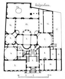 | Keywords: Berlin Palais Strousberg Grundriss Erdgeschoss.jpg Berlin - Ground floor plan of the Palais Strousberg at 70 Wilhelmstraße <small> 1 Entrance 2 Vestibule 3 Reception room 4 Ballroom 5 Boudoir 6 Dining room 7 Billiards room 8 Library 9 Antechamber 10 Ambassadors work room11 Bedroom 12 Art gallery 14 Antechamber 16 Passage 17 Courtyard with glazed roof 18 Buffet room 23 Courtyard 24 Great ballroom </small> Berlin - Grundriss Erdgeschoss Palais Strousberg an der Wilhelmstraße 70<br> <small>Grundriss Erdgeschoss <br> 1 Vorhalle 2 Vestibül 3 Empfangszimmer 4 Tanzsaal 5 Boudoir 6 Speisesaal daneben im Obergeschoss Schlafzimmer 7 Billardzimmer 8 Bibliothek 9 Vorzimmer10 Arbeitszimmer des Botschafters 11 Schlafzimmer 12 Bildergalerie 14 Vorzimmer zum Festsaal 16 Durchfahrt 17 Höfe mit Glasüberdachung 18 Anrichtezimmer 23 Hof 24 Großer Festsaal </small> Berlin und seine Bauten Verlag Wilhelm Ernst Sohn 1896 1896 August Orth PD-old Palais Strousberg |