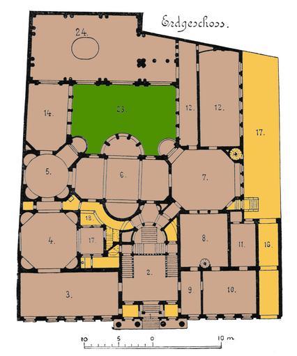 | Keywords: Berlin Palais Strousberg Grundriss Erdgeschoss coloured.jpg Berlin - Ground floor plan of the Palais Strousberg at 70 Wilhelmstraße <small> 1 Entrance 2 Vestibule 3 Reception room 4 Ballroom 5 Boudoir 6 Dining room 7 Billiards room 8 Library 9 Antechamber 10 Ambassadors work room11 Bedroom 12 Art gallery 14 Ballroom antechamber 16 Passage 17 Courtyard with glazed roof 18 Buffet room 23 Courtyard 24 Great ballroom </small> Berlin - Grundriss Erdgeschoss Palais Strousberg an der Wilhelmstraße 70<br> <small>Grundriss Erdgeschoss <br> 1 Vorhalle 2 Vestibül 3 Empfangszimmer 4 Tanzsaal 5 Boudoir 6 Speisesaal daneben im Obergeschoss Schlafzimmer 7 Billardzimmer 8 Bibliothek 9 Vorzimmer10 Arbeitszimmer des Botschafters 11 Schlafzimmer 12 Bildergalerie 14 Vorzimmer zum Festsaal 16 Durchfahrt 17 Höfe mit Glasüberdachung 18 Anrichtezimmer 23 Hof 24 Großer Festsaal </small> Berlin und seine Bauten Verlag Wilhelm Ernst Sohn 1896 1896 August Orth PD-old GFDL Cc-by-sa-3 0-migrated Palais Strousberg Boudoirs |