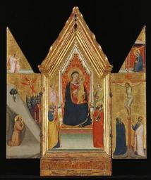 Keywords: Bernardo Daddi - Madonna and Child Enthroned with Saints - 34.20 - Minneapolis Institute of Arts.jpg Religion NT Triptych center panel gabled; wings together form gable Madonna and Child with Paul Peter Catherine and Helena Francis Miracles Stigmatization of Francis in retreat on Mount Alverna Annunciation Mary usually reading is visited by the Angel Crucified Christ with Mary and John the Evangelist Central panel Madonna and Child enthroned; the child stands in his mother's lap facing her his arms extended; the Virgin looks at him with a half smile; she wears a red lined blue mantel over a dark red gown; back of throne decorated with slender arabesques on scarlet ground; to left of throne stands St Helen and St Peter to the right St Catherine and St Paul; the colors of their robes are ivory rose mauve gold dull green; gold leaf background; left wing St Francis Receiving the Stigmata; dull mauve robe; angel's drapery scarlet; gold background; right wing Crucifixion; Mary in black standing at foot of cross; gold leaf background; Pinnacles The Annunciation Virgin's robe black against scarlet background with decorative motifs of throne angel diaphanous rose drapery against gold leaf background; panels bordered with incised motif haloes bear incised decoration; gold background brilliant colors fresh 23 3/8 x 19 15/16 x 1 7/8 in 59 42 x 50 64 x 4 76 cm 23 3/8 x 10 x 1 7/8 in 59 37 x 25 4 x 4 76 cm panel center 18 11/16 x 5 x 7/8 in 47 47 x 12 7 x 2 22 cm panel right 18 9/16 x 4 15/16 x 7/8 in 47 15 x 12 54 x 2 22 cm panel left 34 20 https //api artsmia org/images/10448/4217/large jpg Q1700481 Tempera and gold ground on poplar panel Madonna and Child Enthroned with Saints https //collections artsmia org/index php page detail id 10448 Q20891438 |